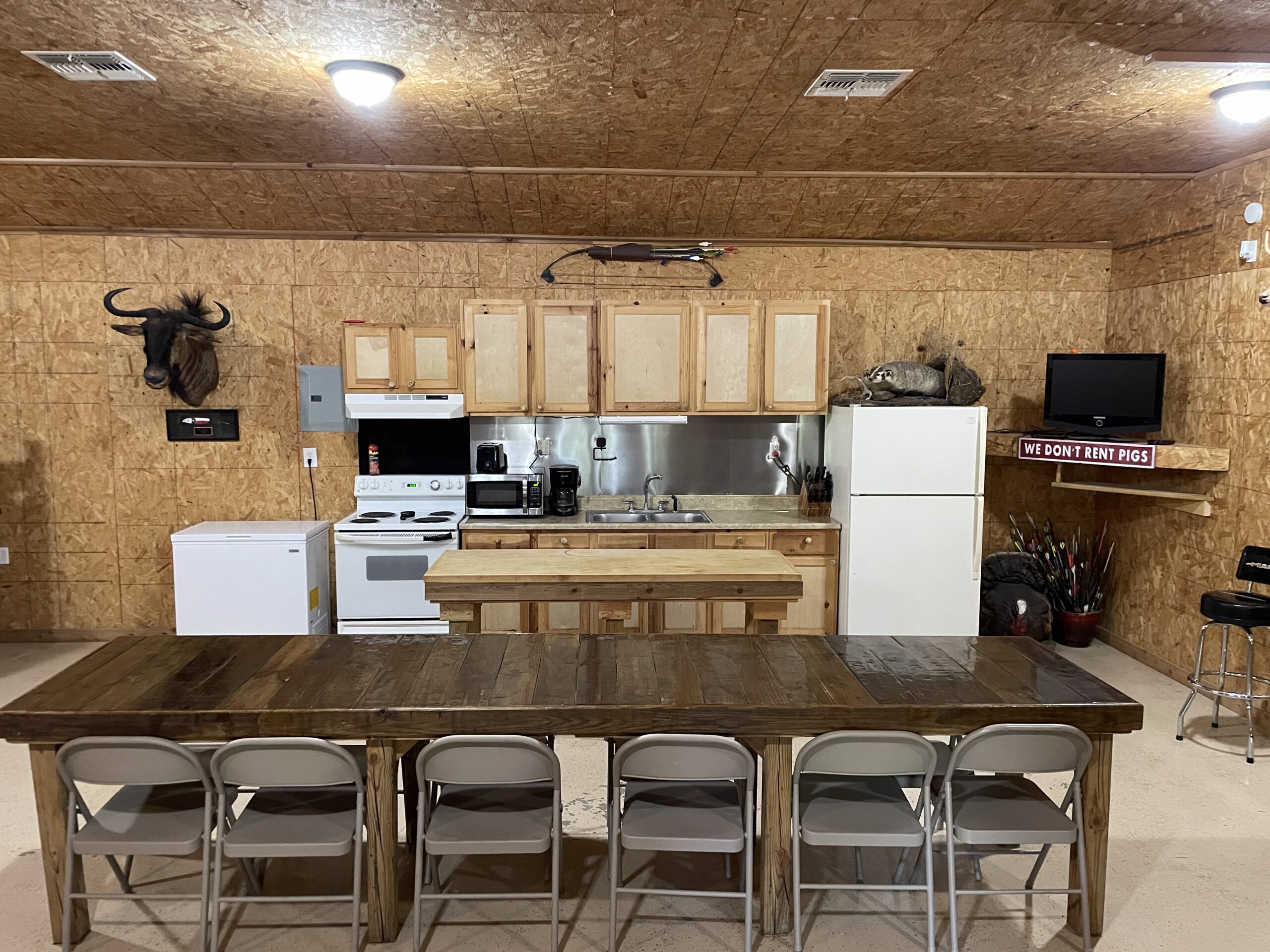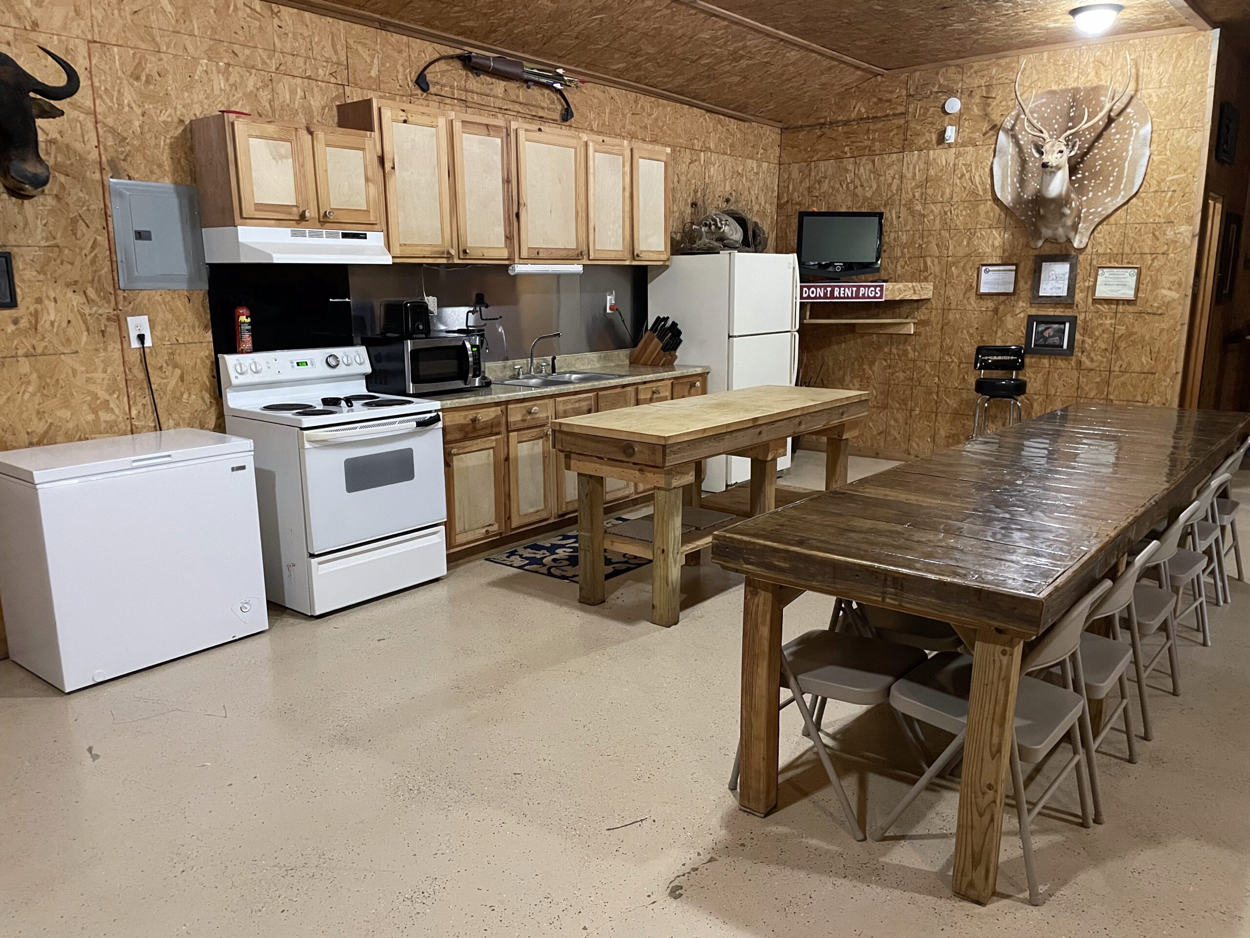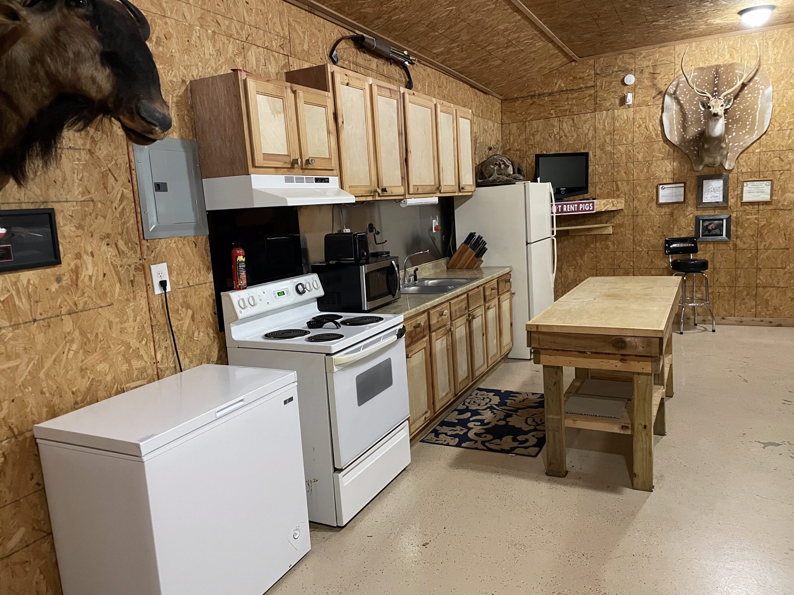 - Full Kitchen with supplies - stove, oven, microwave, refrigerator, chest freezer, coffee pot, pots, pans, utensils.